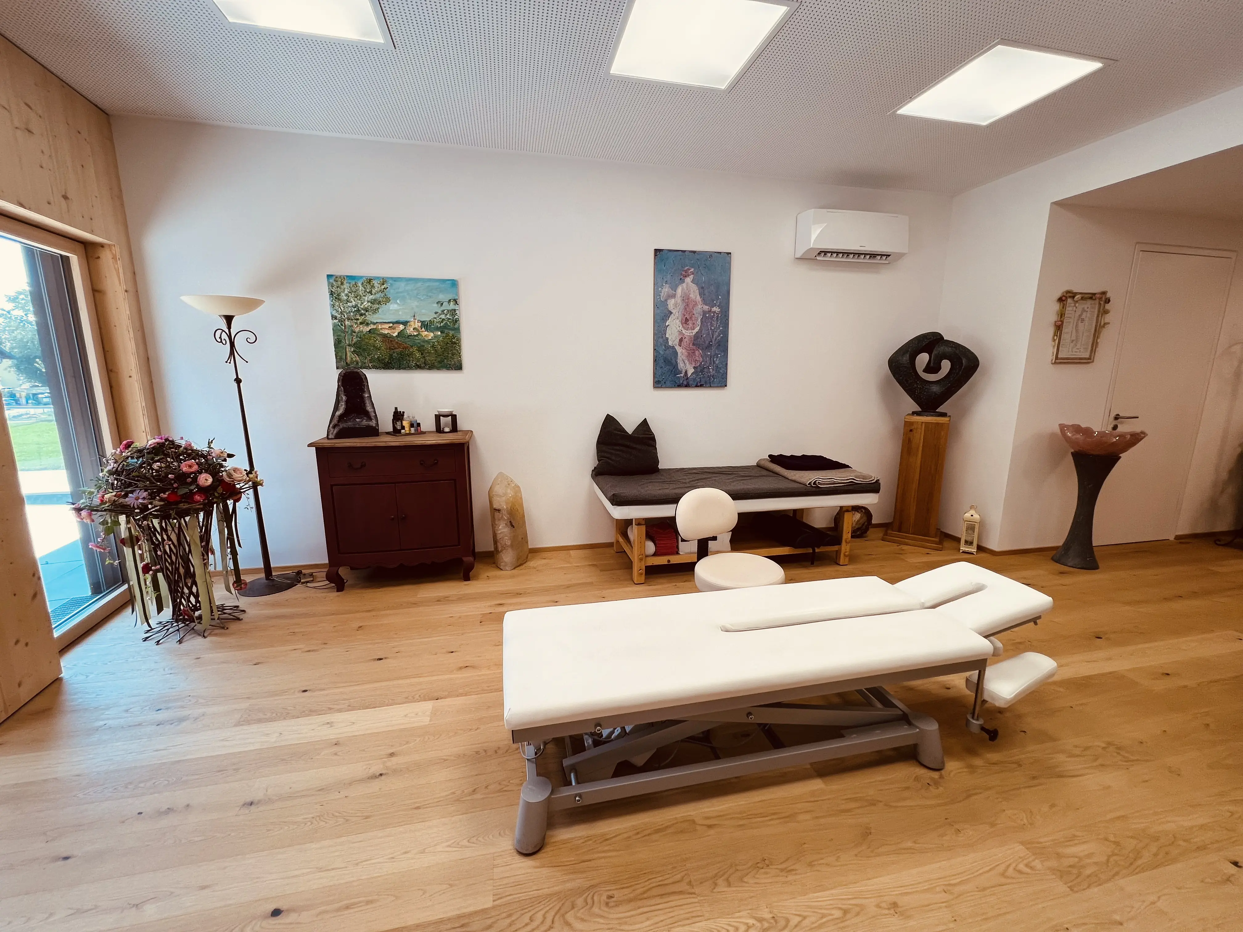 Meine Praxis im Bio-Art-Campus in Seeham steht ganz im Zeichen des Wohlfühlens. Die Räume sind hell gehalten und so ausgestattet, dass sich die Klientinnen und Klienten entspannen und die Sitzung genießen können.