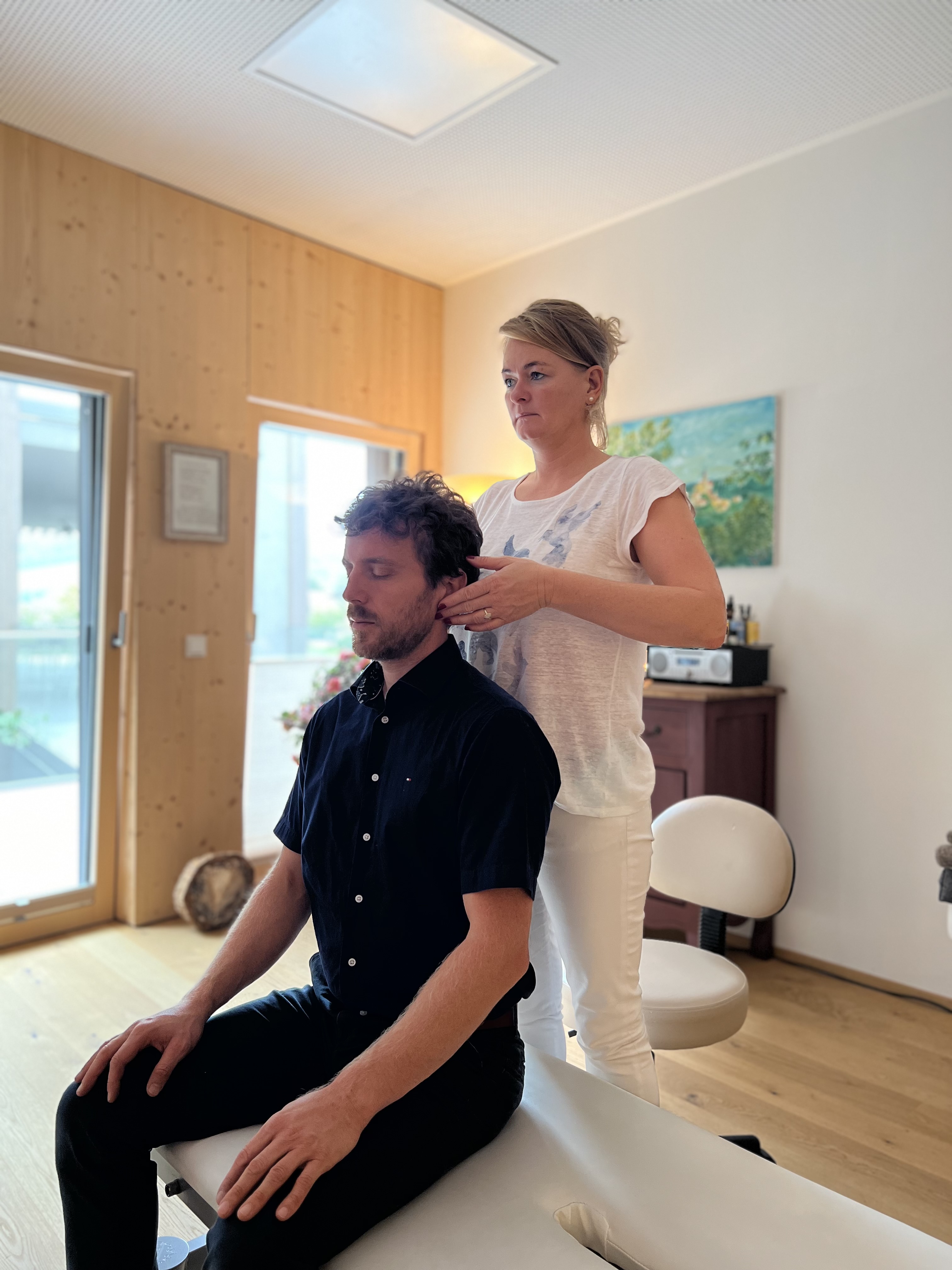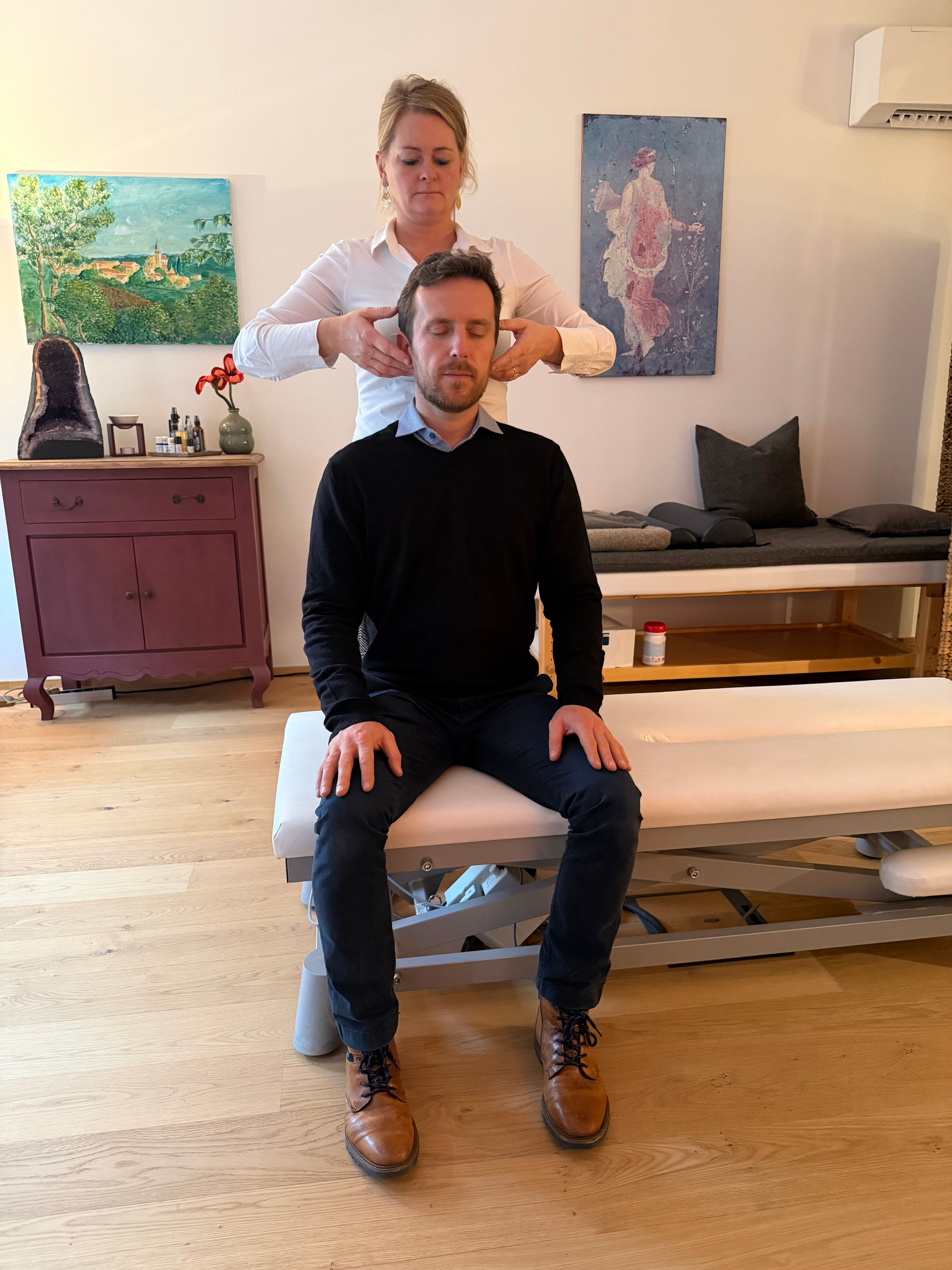Während der Sitzung übertrage ich einen sanften, gezielten Impuls auf die Querfortsätze des C1-Wirbels und versetze diesen in Schwingung, um bei den Menschen eine Selbstregulierung anzuregen.